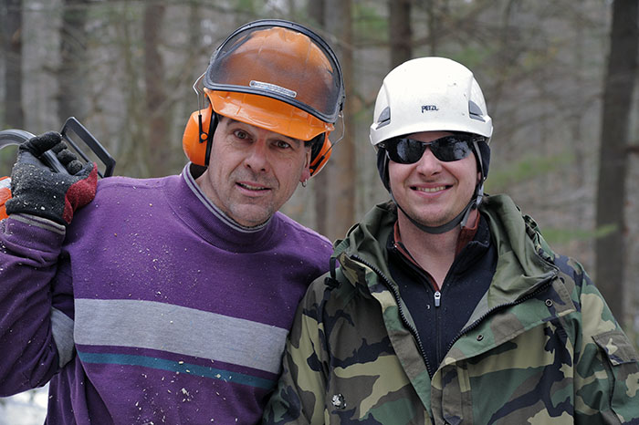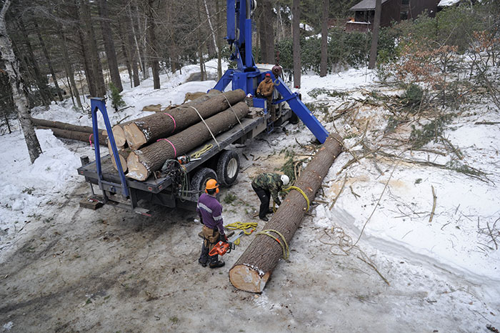 Our house is surrounded by enormous white pines. Every once in a while, during a storm one of them falls down. Before I became a homeowner I used to love violent weather. Wind, lightening, heavy rains…the more the better. Waking up in the middle of the night with the wind is blowing like crazy isn’t so much fun when you are waiting to hear a loud crack and hoping that an eighty year old tree doesn’t land on your head. When our neighbor Ken decided to have a few of the larger pines around his house taken down, it seemed like a good idea to join in. We began talking to Leon and Shay this summer, and they encouraged us to wait until the winter to have the work done. They showed up Wednesday morning with a giant crane, a chipper, a tractor and lots of chain saws.