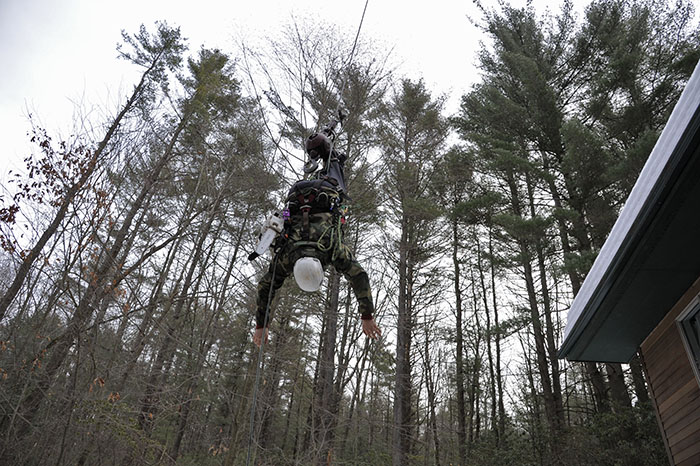 These are huge trees. I got no work done over the last two days, watching these guys work to take them down. Shay would clip his climbing harness into the ball of the crane, be raised three quarters of the way up the tree and attach one of these yellow chains to the trunk. He would then rappel down to about 50 feet off the ground and make a cut. The crane would support the weight of the tree and move it over the house to the driveway where it would be dragged to the street.