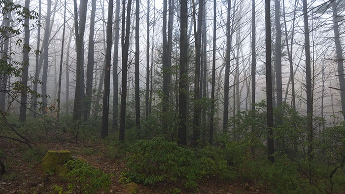 It actually snowed yesterday morning. It melted away by late afternoon, but it was foggy and wet all day. It is much warmer this morning, and still a bit foggy. The sun is out now and all the fog is gone. / This is the view looking south off our deck. The mountain laurels should bloom in the next three or four weeks, and by mid May, there are literally hundreds of pink lady’s slippers (Cypripedium acule) that return year after year.
