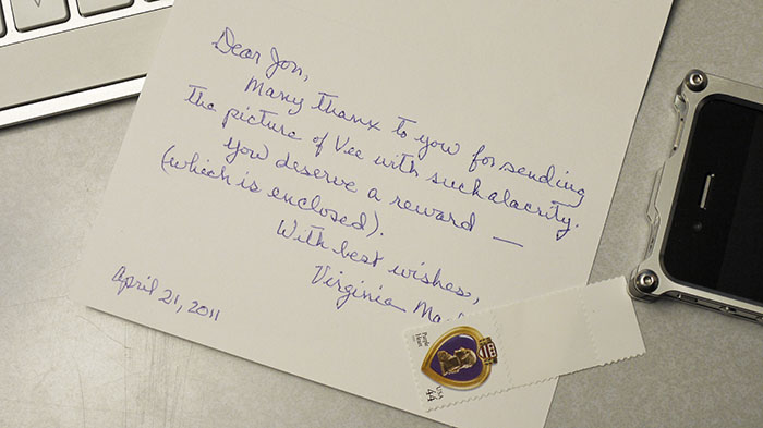 A while back, I photographed my friend Virginia Westbrook as she needed some resume shots and would be in Amherst visiting her son. It was great to see her after a long while of little contact. A few weeks ago she sent an email asking if I could send a print of one of the shots to her mom for her birthday, which I was happy to do. Today I received this note in the mail from Virginia’s mom with the enclosed “reward”. It made me very happy.