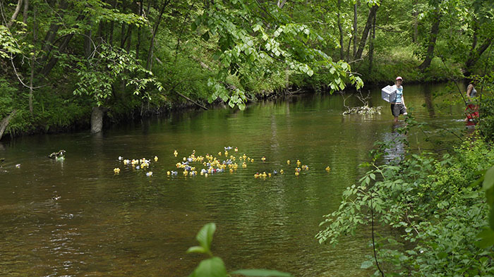 Last Saturday at the Amherst Farmer’s Market Cris bought a raffle ticket for the 4th Annual Fort River Celebration Day Rubber Ducky Derby. It was in support of the Hitchcock Center and the Rushing Rivers Institute. Hey, $5.00; goes to a good cause. On our way to the event today she couldn’t find the stub from the form, but she thought our number was 426. When we got to Goff park, we checked the list and we were actually #258 which is a favorite number of ours. I was kind of impatient for the off, and as usual making rude comments to Cris. The organizers were telling all the kids to make lots of noise during the race so once the ducks hit the water, I started yelling 258 258 258 258…….Cris got as far away from me as she could.