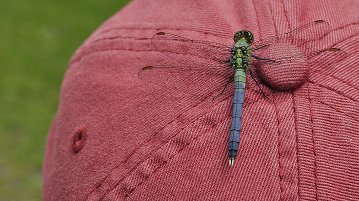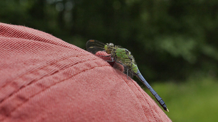 Cris and I went for a walk with the Pearl this afternoon. This dragonfly landed on her hat and was kind enough to hang around while I took some shots.