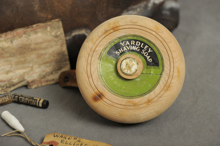 It looks like there is a burn from a cigarette on the wooden shaving soap box.