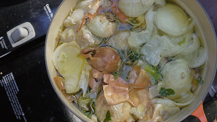 My dear friend John Wilson makes stock out of any vegetable materials left over from his cooking preparations. When Peter and I were with him in March he told me how he does it. So for the past several months I have been collecting bits of carrot, onion, garlic, brussels sprouts, celery, tomato; well, you get the idea. I have put them in a bag in the freezer while waiting for a good time to start the process. I have no idea how it will turn out, but I’ll know more in about 3 hours. It is smelling pretty good so far.