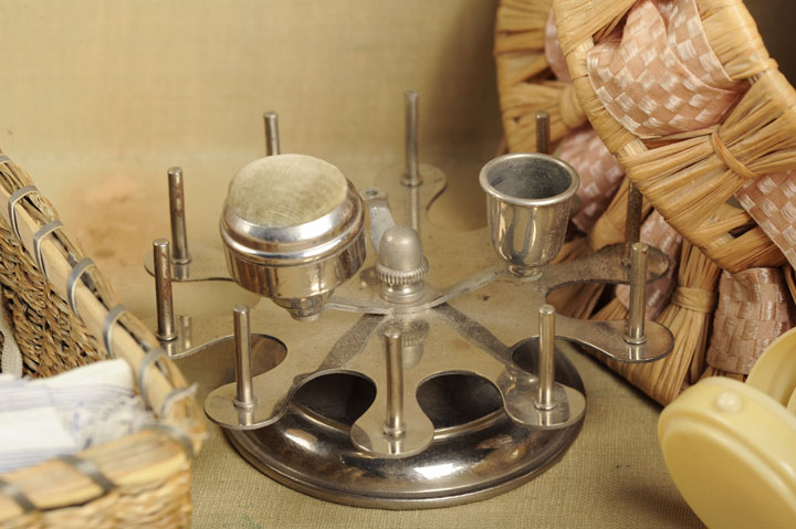 Jon, you are right about this object, it is a reel stand that held 10 spools, with pincushion. Looks to be made of steel? These items were hugely popular in the Victorian era. The egg-cup shape may have been intended to hold a darning egg. Flora seemed to be drawn to Arts & Crafts/Art Nouveau, but the reel stand has a more contemporary look to it. (from M. Beaudry, author of Findings: The Material Culture of Needlework & Sewing).