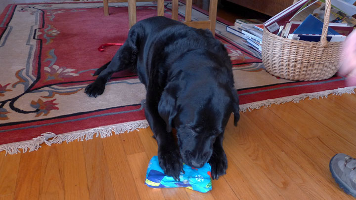 Cris was putting some wrapped presents under the tree yesterday, and Pearl went right to this “Mega P’nut” dog treat. She got an early gift.