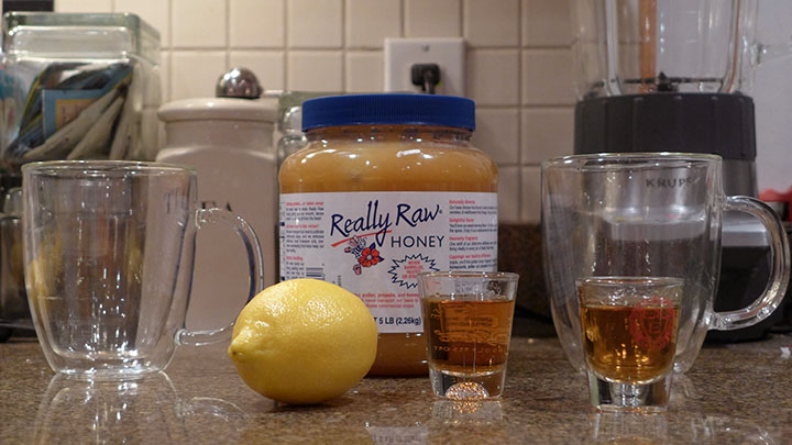 I am drinking one as I write this. It seems kind of silly as it is the essence of simplicity to make a hot toddy, but here’s what I usually do. (I am making two here since even if you are not sick it will really hit the spot. Cristine loves them.) Three main ingredients. A thick slice of lemon, a big teaspoon of honey, and some amber liquid (I usually use a fairly cheap blended Canadian whiskey, but others use rum or scotch, or well, just about anything. I would welcome suggestions for alternatives for those of you who don’t use alcohol.)