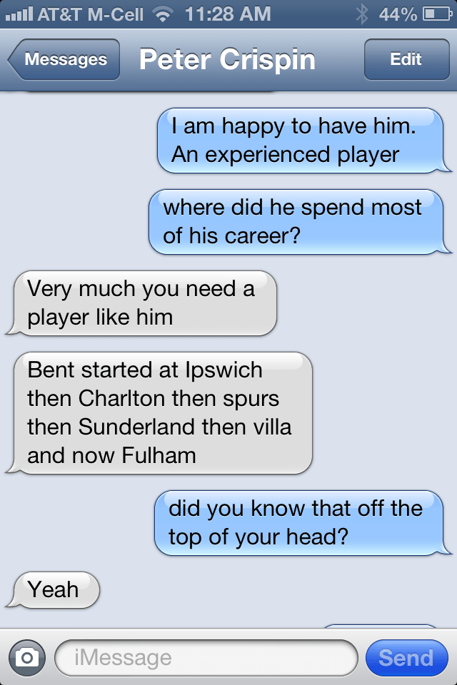 This weekend marks the start of the English Premiership season, and Peter and I follow our respective teams (Manchester United and Fulham) faithfully. We texted back and forth yesterday during the Fulham and United wins. He has an amazing mind for the game and when I asked him about Darren Bent, who is new to Fulham, this is what I got as a response.