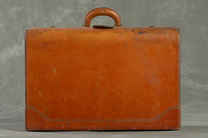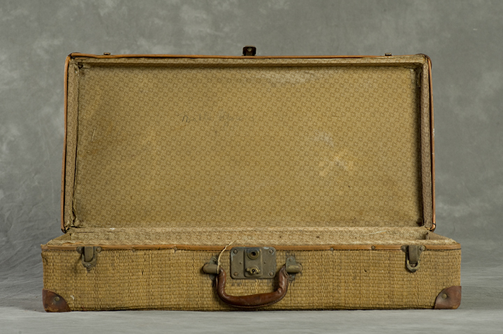 I really liked this case when I shot it on Wednesday. It belonged to Mabel Y. The pattern on it is actual weave as opposed to a fake print pattern made to look like weave. It, like many of the suitcases, has no means to support the top when opened, so Peg and I are constantly coming up with some way to hold it upright for the photograph.