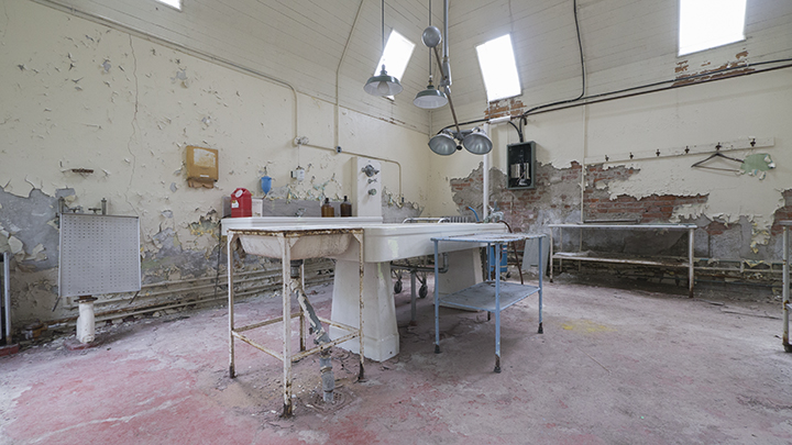 Since I had already been in several of the buildings on the tour, Peggy Ellsworth suggested I come over to the morgue when it was between groups. She is one of the main boosters of Willard’s past, and spends a great deal of her energy keeping the spirit of the place alive. She told me an amazing story of her first day on the job after she had graduated from the nursing school. It involved her first autopsy when she was standing right where she is in this photograph.