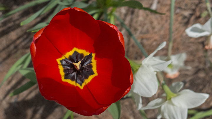 About 10 years ago I planted a bunch of daffodil and tulip bulbs. At the time I remember reading that the daffs would keep coming up annually, but that the tulips had a life of around five years. This is the last of them to flower; a lone red tulip in the middle of daffs and baby’s breath. I’ll be surprised if it comes back next year, but this one showed some resilience.