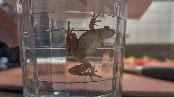 With all the TV timeouts, I didn’t get home until about 7.45. We had some nice mozzarella and one of the last good tomatoes of the season, and Cris wondered if any of the basil that we grow in pots on the deck was still edible. It was dark out so she brought in the pot and started trimming leaves. Quite quickly she noticed that this froggie had come in with the plant. We caught it, and after I took this photograph, put him (her?) back outside. Love those sticky feet.