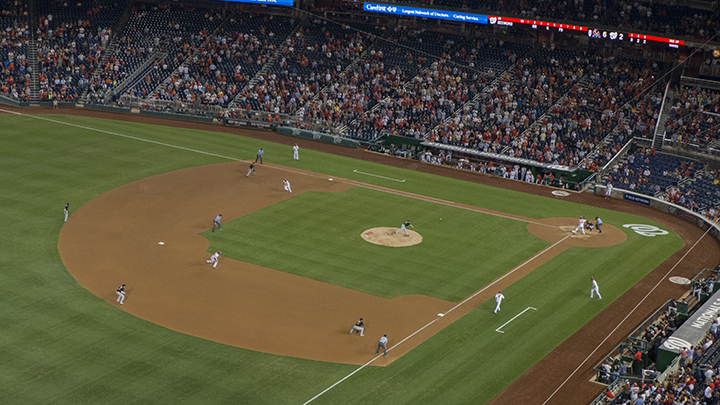 This is my favorite baseball situation. Bases loaded, 2 outs, 3 balls and two strikes on the batter. The runners are going on the pitch (if you look closely, you can see the ball on the way to the batter.) In this case, Ian Desmond ripped a single into right field and two runs scored. The Nats lost 6 – 4 and are barely hanging in for a playoff spot. Maybe next year.