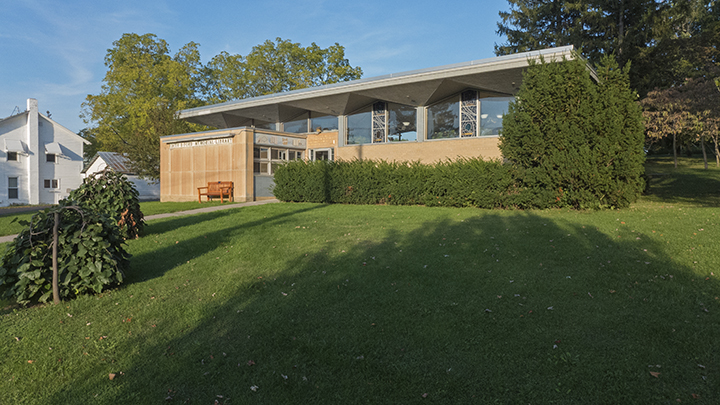 On Thursday, I made the trip from Western Massachusetts to Ovid, NY for my talk about the suitcases. I arrived late in the afternoon and the light was nice on the front of this lovely early 1960s building.