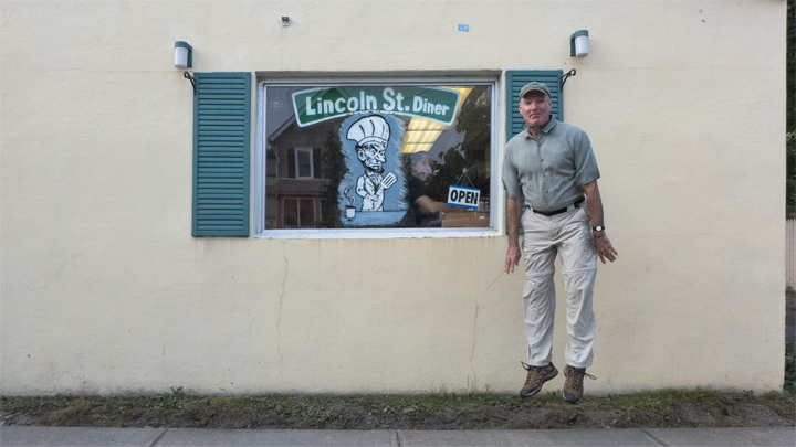 I drove to Ithaca on Friday in order to attend the annual Willard Psychiatric Center employee reunion. Saturday morning, Peter Carroll and I started our day in the usual way; breakfast at the Lincoln St. Diner and then a photo of him jumping. It is the best diner breakfast anywhere.