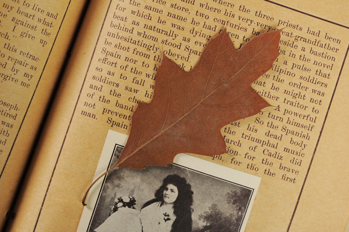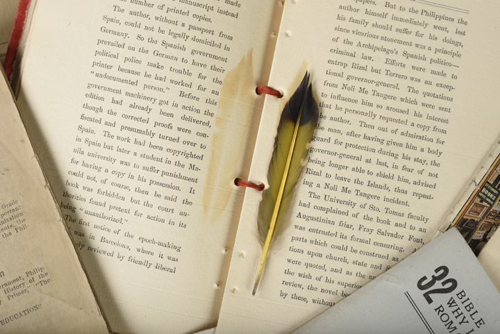 Rodrigo had quite a few books. While shooting yesterday we came across several objects that he had pressed between pages. This feather is breathtakingly beautiful, and I love the discoloration on the opposite page.