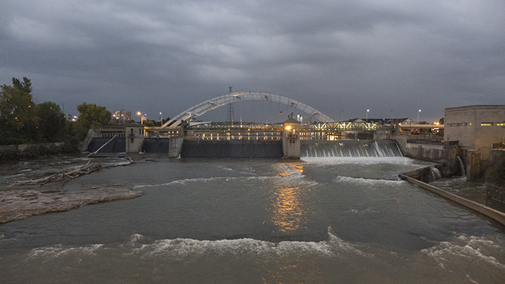 I am in an EconoLodge in Brockport, NY on my way to meet some Erie Canal folks to spend tomorrow shooting the autumn inspection of some of the locks east of Buffalo. Stopped in Rochester for a bite to eat just as the evening was arriving.