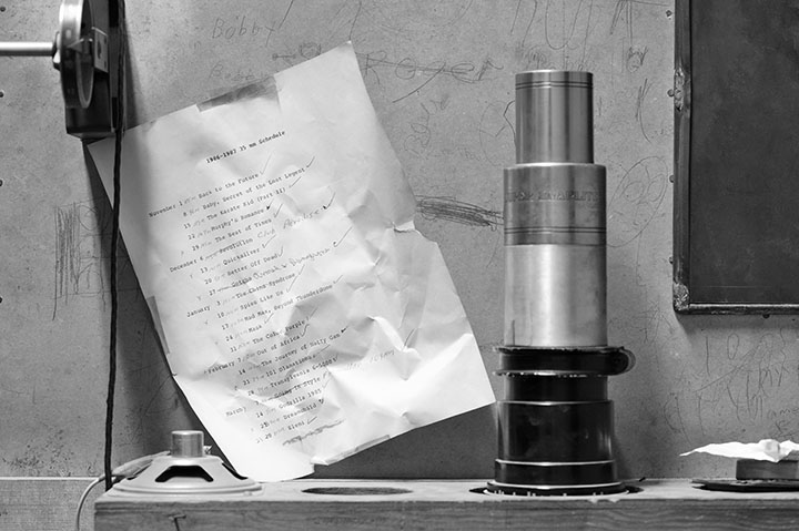 The projection room seemed to me to be almost totally intact. The sheet of paper here might be hard to read online, but at the top of the list is “Back To The Future”.