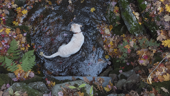 I think I post a version of this photograph more than I probably should. We have had a ton of rain in the past few days, and Olive and I had a lovely wet walk in the woods this afternoon. But for some reason, the water, the leaves, and the dog make me feel quite happy and I wanted to share it.