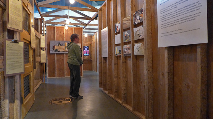The space is situated very close to the front of the building. There are basically three components. On the left of this photograph (↑) is the Utica Crib display which deals with the idea of confinement. To the right of that is the entrance to the “attic” where the cases are located, along with my photographs and Karen Miller’s poems. And out the back is the interactive space where visitors can write about their feelings toward the exhibit and the ideas represented.