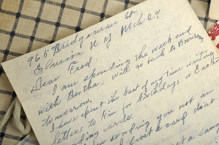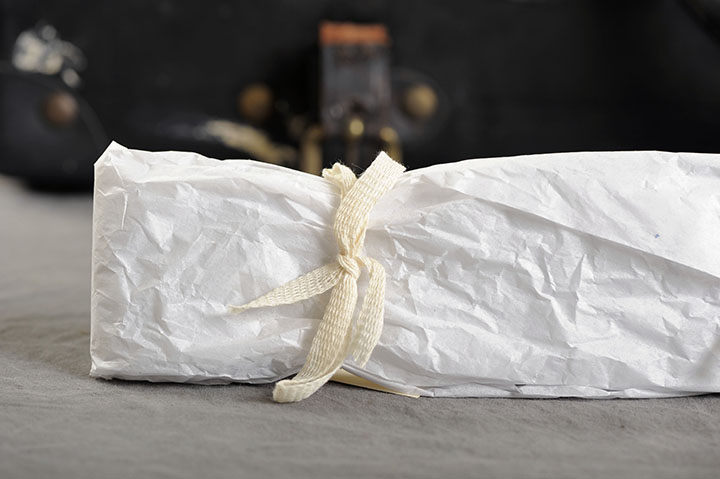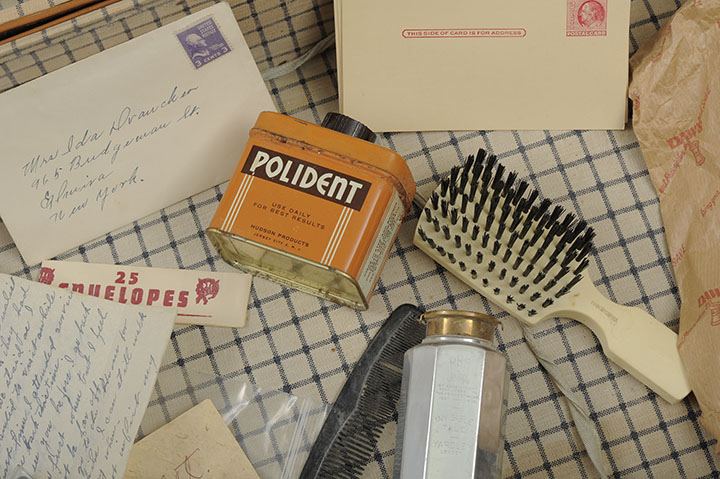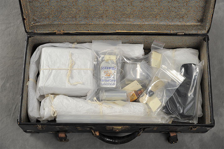 The New York State Museum did an amazing job conserving and cataloguing the suitcase collection. Three staffers did most of the work. Sarah Jastremsky, Christine Allen, and Kara Chambers worked for months on the project, and they each had their own style of wrapping. I have never been able to tell who did which case, but they all did an amazing job. This particular case represents one of those distinctive styles. / Peg and I always try very hard to return the suitcases to their original condition once we are done shooting.