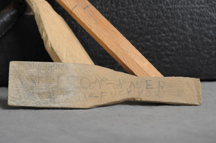I don’t believe this paddle has anything to do with the instrument. It is clearly hand carved and though I can’t read the writing on the left side, one phrase on the right is pretty clear.