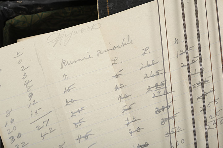 Inside the box were also two sheets of paper used to keep score for “Rumie pinochle”.
